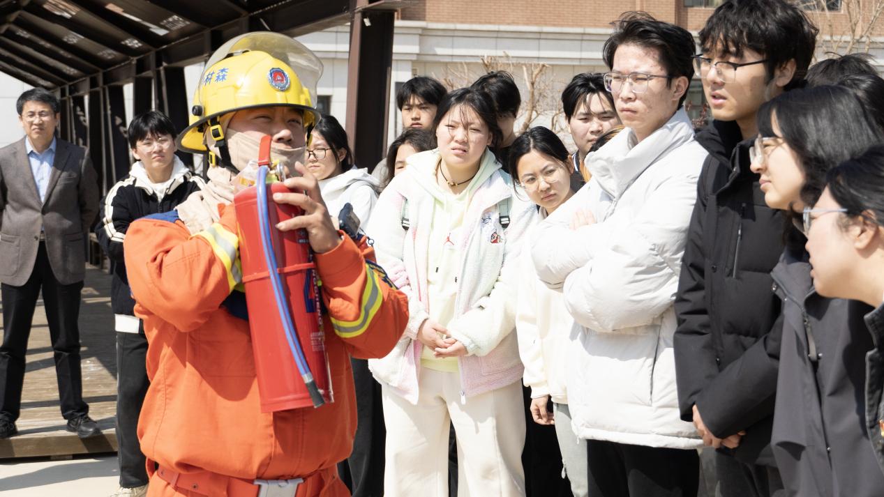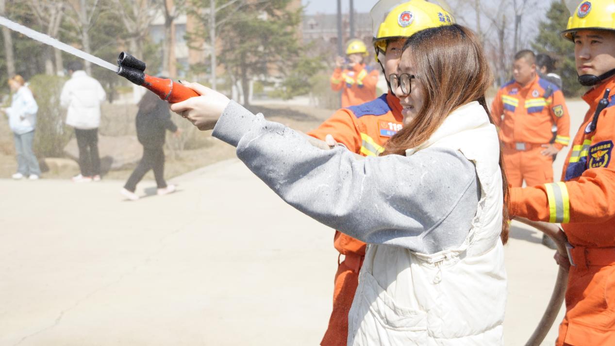 理论培训结束后,森林消防队队长王传颂带领消防战士们在建业楼下为大家展示了各类消防器材的使用方法和操作技巧。师生党员亲身体验了风力灭火机、高压水枪和干粉灭火器等林业消防器材的实际操作过程。