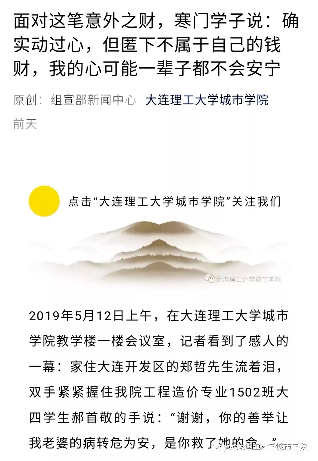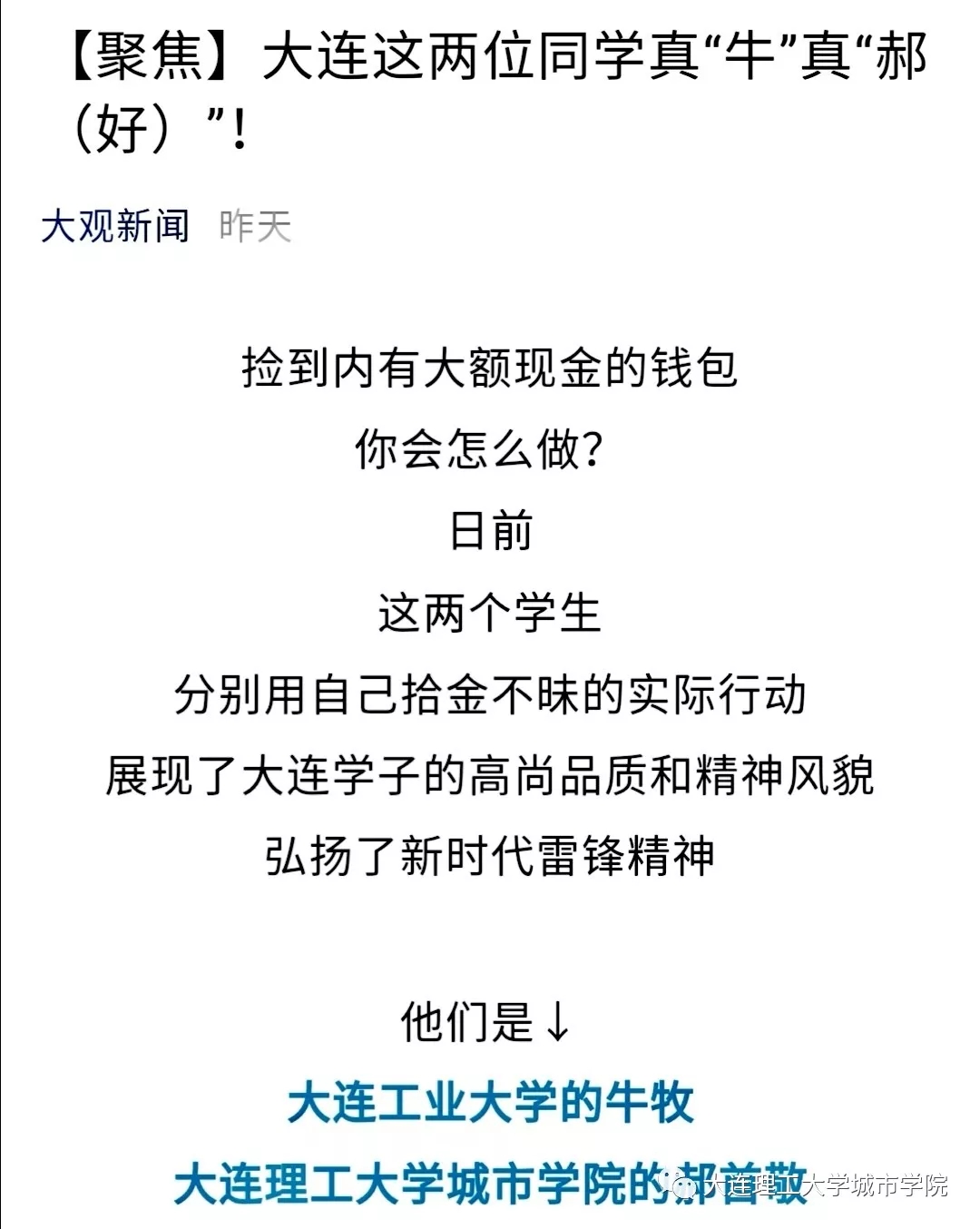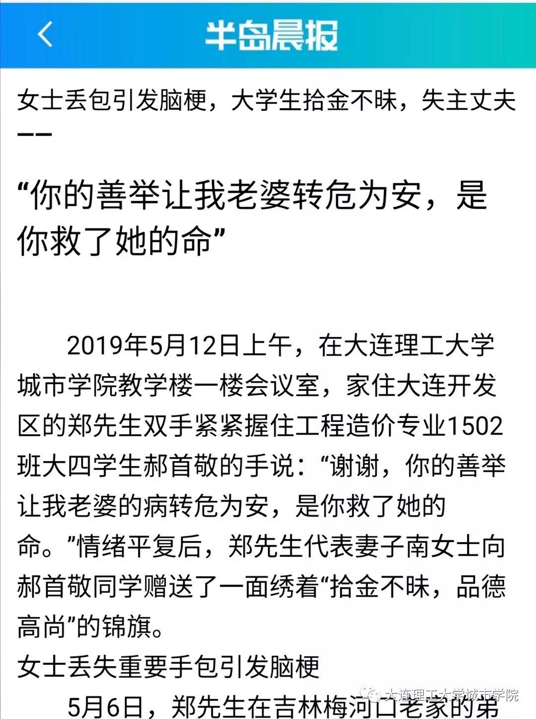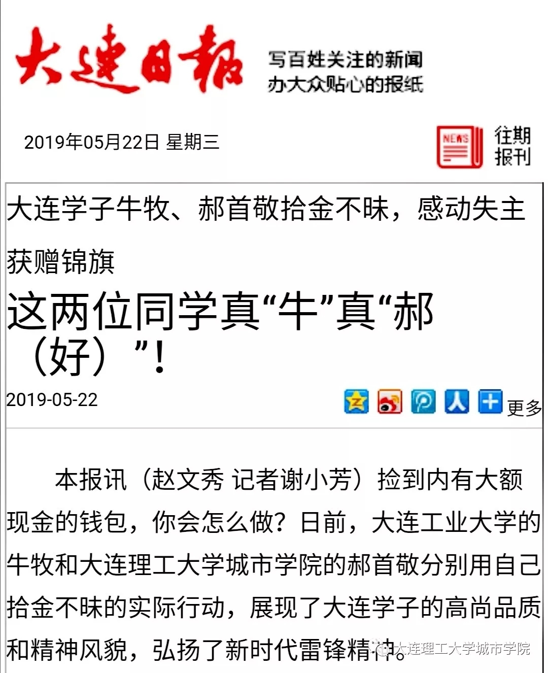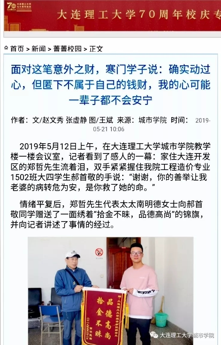 5月20日,69堂 学子郝首敬拾金不昧的消息经本号及大工新闻网报道后,成了师生热议的话题。当天,央广网、大连日报、半岛晨报等多家媒体先后转载了这篇报道。