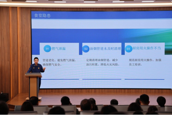 会上,大连市消防救援支队作战与训练处指挥长曹志伟作专题辅导报告。他以“高校消防安全与应急处置”为题,通过典型案例视频展示,系统讲解了火灾危害特性、火灾发展阶段特征、初期扑救策略等六个维度的专业知识。他强调高校消防安全管理的重要性和紧迫性,着重介绍了“三懂”“四会”“四个能力”等消防知识要点,并对高校消防人员应具备的技能和素养提出了具体指导。