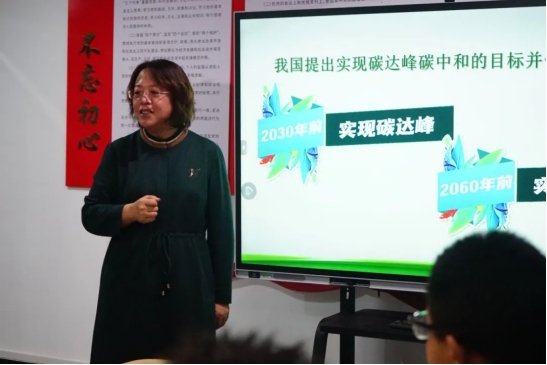 宋老师从联合国政府间气候变化专门委员会发布报告的数据导入,引导在场学生分析总结出全球气候变暖会给环境和人类带来什么样的影响和危害;讲解我国提出实现碳达峰碳中和的目标和重要部署,让学生们深刻体会到“双碳”行动已经迫在眉睫。