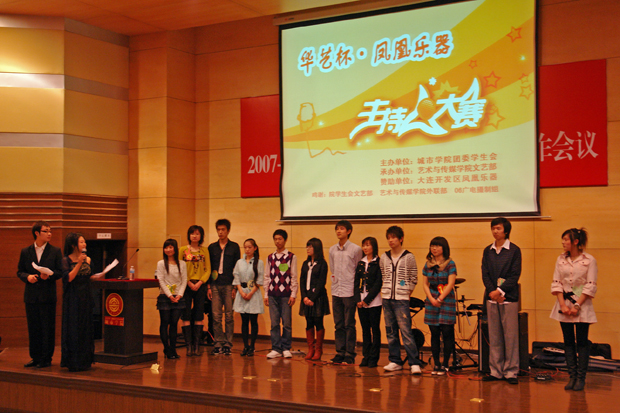 团委老师李琢,新闻系团委书记朱守先,电子与计算机工程学院教师暴丰,赞助商开发区凤凰乐器行经理刘东和三名学生代表组成。